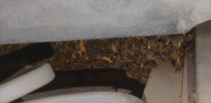 壁の隙間に巣を構築中と判断、そ~とシャッターを開け横から見ると蜂がうじゃうじゃ