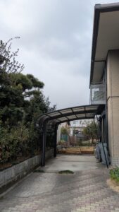 今回のミッションは、新築時に頂いた鉢植えのゴールドクレストを直植えしたところ、25年経つと写真のように6m越えに成長して家に覆いかぶさりかけてピンチ!しかもカーポートの後ろで伐採困難の悪条件、地面も盛