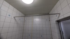 今回のミッションは、浴室の物干しバー取付。材料はすべてホームセンターで購入可能なので安くできます。昔ながらのタイル張りの壁でビミョーに台形!どーする!あんまり角度があると下地調整がいりますが今回はギリ